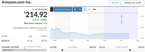 세계 최대 전자상거래 업체 아마존 주가는 전장보다 8.27% 급락한 214.75달러에 장을 마감했다. 아마존은 전날 장 마감 후 시장 예상보다 나은 2분기 매출액과 주당순이익을 발표했지만, 함께 제시한 3분기 영업이익 전망이 시장 예상치를 밑돌면서 실망 매물이 쏟아졌다.