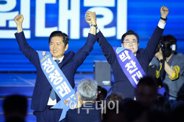 ▲정청래(왼쪽), 박찬대 더불어민주당 당대표 후보가 2일 경기 고양시 킨텍스에서 열린 제2차 임시전국당원대회에서 정견발표를 마친 후 당원들을 향해 손을 맞잡아 들어보이고 있다. 조현호 기자 hyunho@