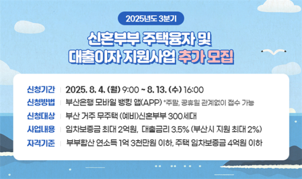 부산시가 무주택 신혼부부의 주거비 부담을 덜기 위한 '신혼부부 주택융자 및 대출이자 지원사업' 대상자를 추가 모집한다. 시는 올해 세 차례에 걸친 정기 접수에도 신청이 저조했던 300세대 분을 이번 3분기 내 추가 선발해 지원할 계획이다.