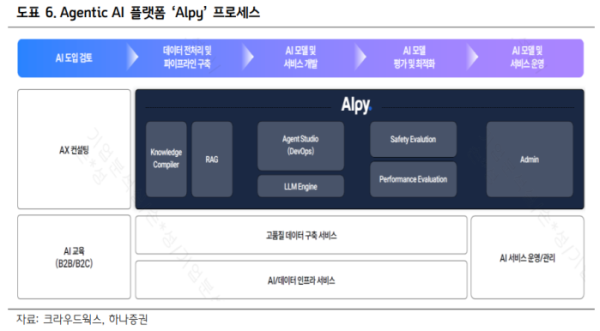 최재호 하나증권 연구원은 "크라우드웍스가 올해 2월 론칭한 ‘Alpy’는 데이터 전처리 및 파이프라인 구축부터 AI 서비스 모델의 운영 및 관리까지 지원하는 원스톱 AI 솔루션"이라며 "자체 플랫폼인 Alpy 에이전트 스튜디오를 통해 쉬운 워크플로우 세팅 및 데이터 관리, 적합한 모델 테스트 등이 가능하고 어드민(Admin)을 통해 AI 서비스의 효율적인 운영을 위한 관리 도구를 제공한다"라고 설명했다.