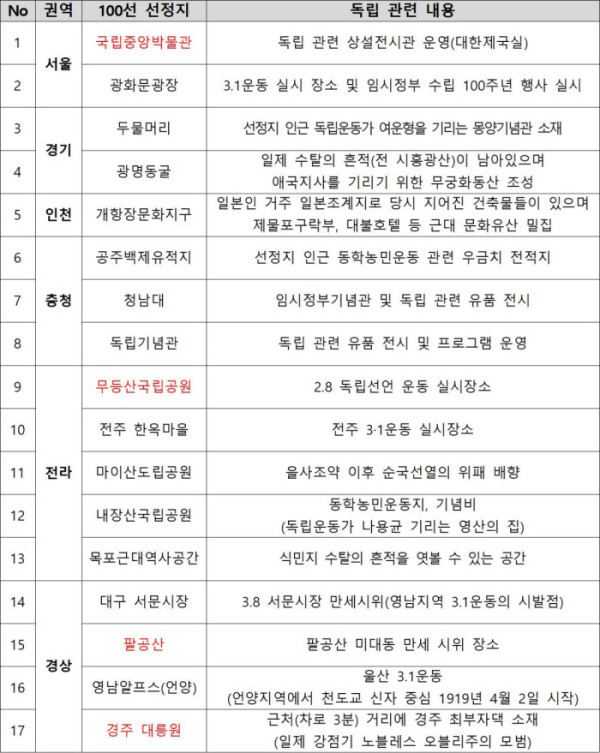 4일 문체부에 따르면, 이번 행사는 한국관광 100선 중 독립운동의 의미를 되새길 수 있는 관광지 13곳을 지정하여 광복의 의미를 되새기기 위해 마련됐다.
