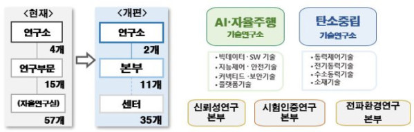 연구개발의 경우 △AI·자율주행기술연구소 △탄소중립기술연구소 △독립본부 △지역분원 체제로 개편 운영된다.