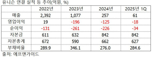유니슨은 2022년부터 올해까지 3년 연속 영업 적자를 기록했으며, 순손실은 그 이전부터 이어져 왔다. 이로 인해 결손금이 누적되면서 2023년부터 부분자본잠식 상태에 빠진 상태다. NICE신용평가 보고서에 따르면 유니슨은 최근 무보증사채 등급이 ‘BB-·Negative’에서 ‘B+·Stable’로 하향 조정되는 등 재무 안정성이 지속해서 악화하고 있다. 부채비율은 1분기 기준 284.6%에 달하며, 차입금의존도 또한 55.1%로 높은 수준을 보이고 있다.