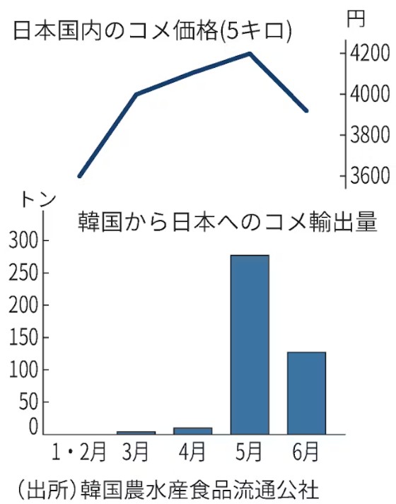 일본 농림수산성 집계에서 일본산 쌀 가격이 가장 비쌌던 5월에 그 가격은 5kg에 평균 4200엔(약 3만9400원) 정도로 전년의 두 배에 달했다. 일본에서 판매되는 한국산 쌀 가격은 4kg당 평균 4000엔이었다. 한국의 수출량도 5월이 가장 많았다.