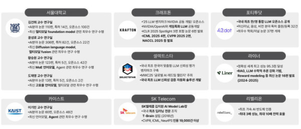컨소시엄에는 국내 최대 게임 상장사 크래프톤, 모빌리티 AI 부분의 강자 포티투닷(42dot), 국내 최고 수준의 추론형 AI 반도체(NPU) 제작사인 리벨리온, 전문 지식·정보 검색에 특화된 AI 에이전트인 라이너, AI 모델의 데이터 안정성을 확보하는 기술을 갖춘 셀렉트스타 등 다양한 분야를 아우르는 선도기업들이 참여했다.