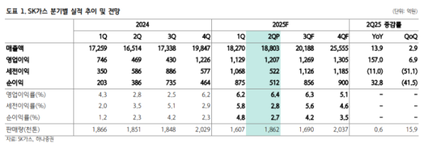 유재선 하나증권 연구원은 “SK가스의 올해 2분기 매출과 영업이익은 각각 전년 대비 13.9%, 157% 증가한 1조9000억 원과 1207억 원”이라며 “LPG 판매량, 환율 약세, 발전 부문 연결 인식이 외형 성장에 기여했고 LPG 부문이 전사 이익 대부분을 차지했다”고 밝혔다.