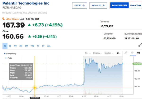팔란티어 주가는 이날 장 마감 이후 발표된 호실적에 힘입어 시간 외 거래에서도 강세를 보이고 있다. 팔란티어는 올해 2분기에 10억 달러의 매출과 0.16달러의 주당순이익을 기록했다고 밝혔는데, LSEG가 집계한 시장 전망치(매출 9억4000만 달러·주당 순이익 0.14달러)를 웃돌았다. 올해 매출 전망치도 기존 38억9000만∼39억 달러에서 41억4200만 달러∼41억5000만 달러로 끌어올렸다.