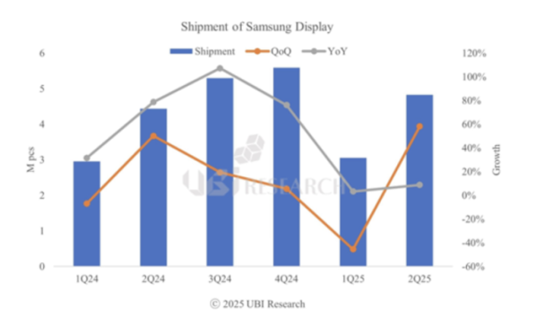 5일 시장조사 전문기관 유비리서치가 발간하는 ‘OLED 디스플레이 마켓 트래커’에 따르면 올해 2분기 삼성디스플레이의 중대형 OLED 출하량은 총 490만 대로 집계되며 전 분기(310만대) 대비 58.2% 증가한 수치를 기록했다.