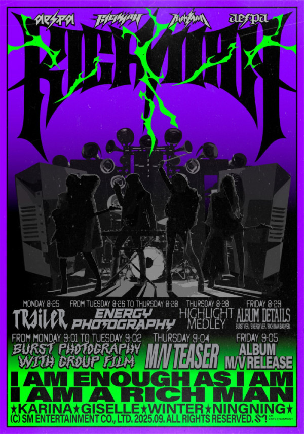 오늘(5일) 0시 에스파 공식 사회관계망서비스(SNS) 채널을 통해 공개된 에스파 미니 6집 ‘리치 맨’의 스케줄 포스터에는 각자 다른 악기를 들고 밴드 멤버로 변신한 네 멤버들의 실루엣이 담겨있어 이목을 끌었다.