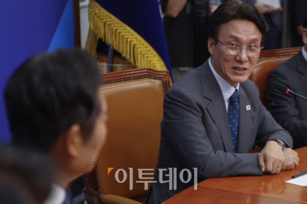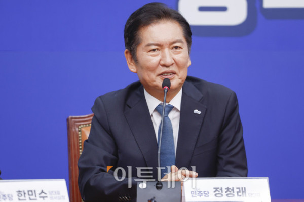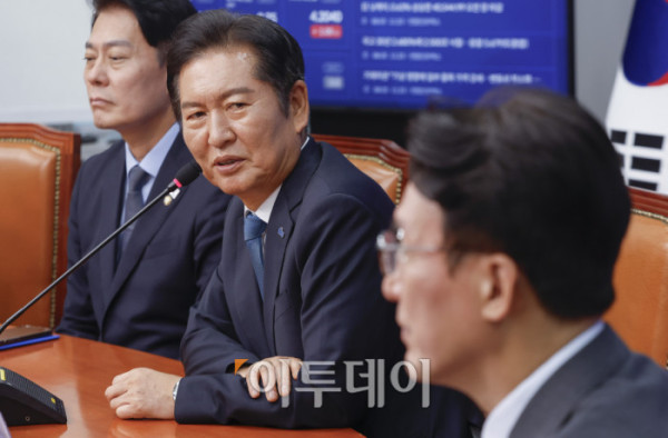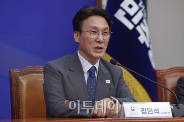 ▲김민석 국무총리가 5일 서울 여의도 국회 더불어민주당 당대표 회의실에서 정청래 대표를 만나 발언을 하고 있다. 조현호 기자 hyunho@