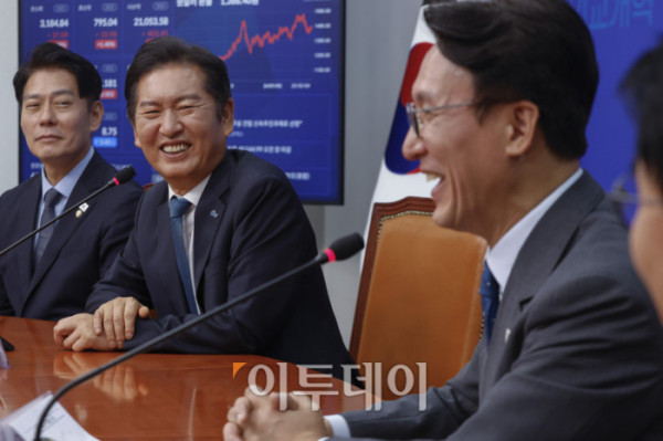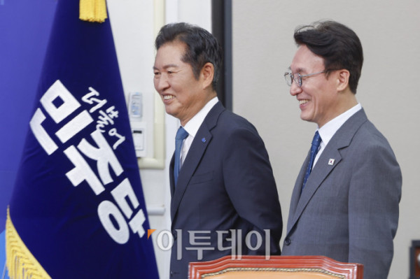 ▲정청래 더불어민주당 대표와 김민석 국무총리가 5일 서울 여의도 국회 당대표 회의실로 들어서고 있다. 조현호 기자 hyunho@