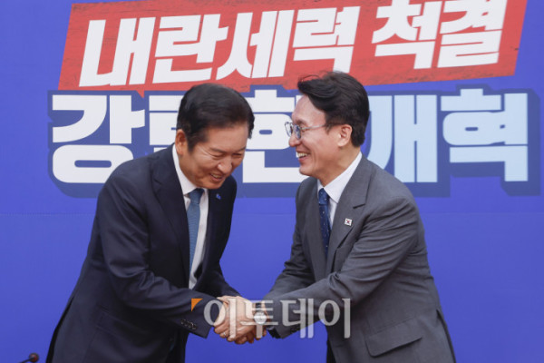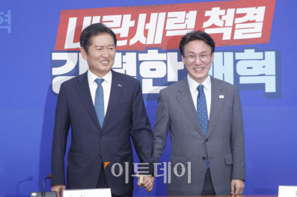 ▲정청래 더불어민주당 대표와 김민석 국무총리가 5일 서울 여의도 국회 당대표 회의실로 손을 잡고 들어서고 있다. 조현호 기자 hyunho@