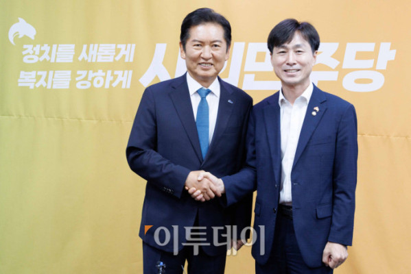 ▲정청래 더불어민주당 대표가 5일 서울 여의도 국회 의원회관에서 한창민 사회민주당 대표를 예방해 기념촬영을 하고 있다. 조현호 기자 hyunho@