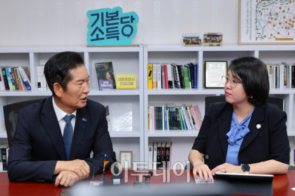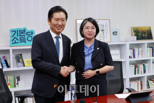 ▲정청래 더불어민주당 신임 대표가 5일 서울 여의도 국회 의원회관에서 용혜인 기본소득당 대표와 만나 대화하고 있다. 조현호 기자 hyunho@
