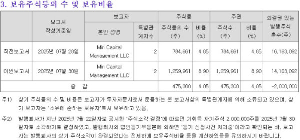 미리캐피탈은 지분 변동 공시에서 “매커스가 7월 22일 자로 공시한 주식소각 결정에 따르면 기취득 자기주식 200만 주를 30일 자로 소각하기로 결정했고, 매커스의 법인등기부등본에 의하면 ‘등기 신청사건 처리 중’이라고 확인되는바, 매커스의 주식소각이 완결됐다는 전제하에 보유주식비율 등을 계산했다”고 밝혔다.