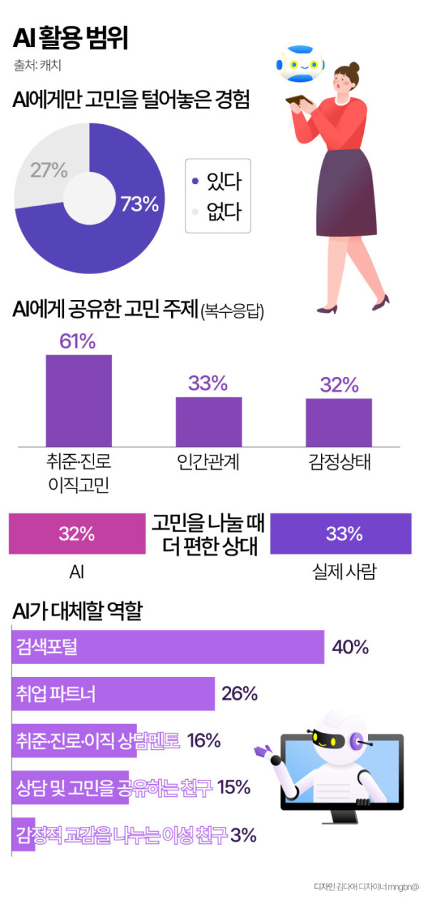 AI에게 공유한 고민 주제(복수응답)로는 '취업준비·진로·이직(61%)'이 가장 많았으며, '인간관계(33%)', '감정 상태(32%)' 등이 뒤를 이었다.