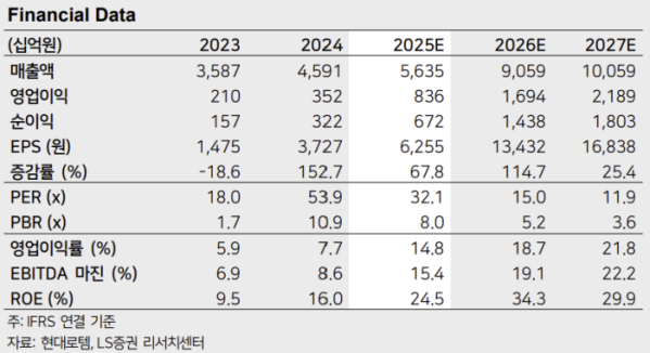 LS증권은 6일 현대로템에 대해서 글로벌 피어 대비 매출 성장율 및 마진율 개선폭이 우위에 있다며 목표주가를 25만 원으로 기존 대비 8.6% 상향 조정했다. 투자의견은 매수를 유지했다.