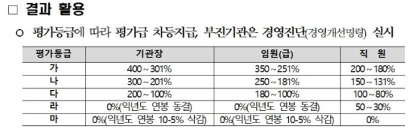 한편, 평가 결과에 따라 지방공기업들의 기관장은 최대 400%에서 0%(다음 해 연봉 5~10% 삭감), 직원은 최대 200%에서 0%까지 경영평가 평가급이 차등 지급된다.