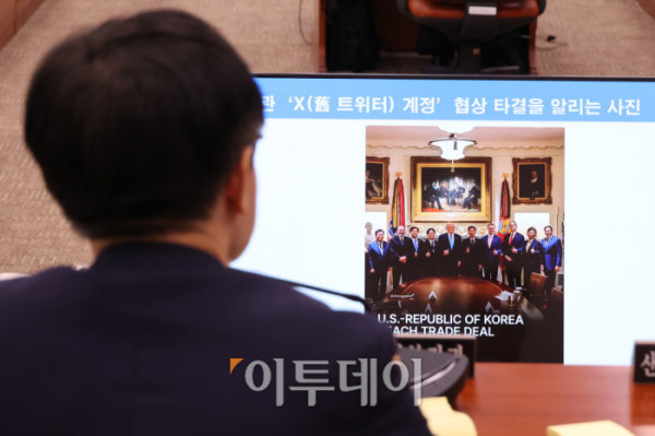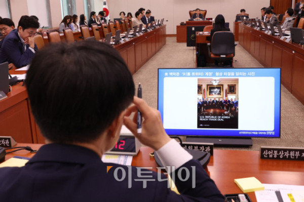 ▲김정관 산업통상자원부 장관이 6일 서울 여의도 국회에서 열린 산업통상자원중소벤처기업위원회 전체회의에서 한미 관세 협상 타결 후 한국 정부 협상단과 도널드 트럼프 미국 대통령이 백악관에서 찍은 사진을 보며 당시 분위기를 전하고 있다. 고이란 기자 photoeran@