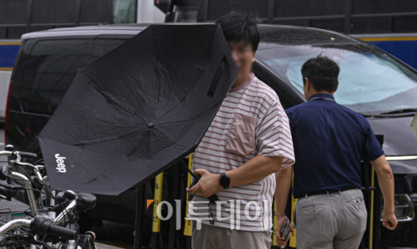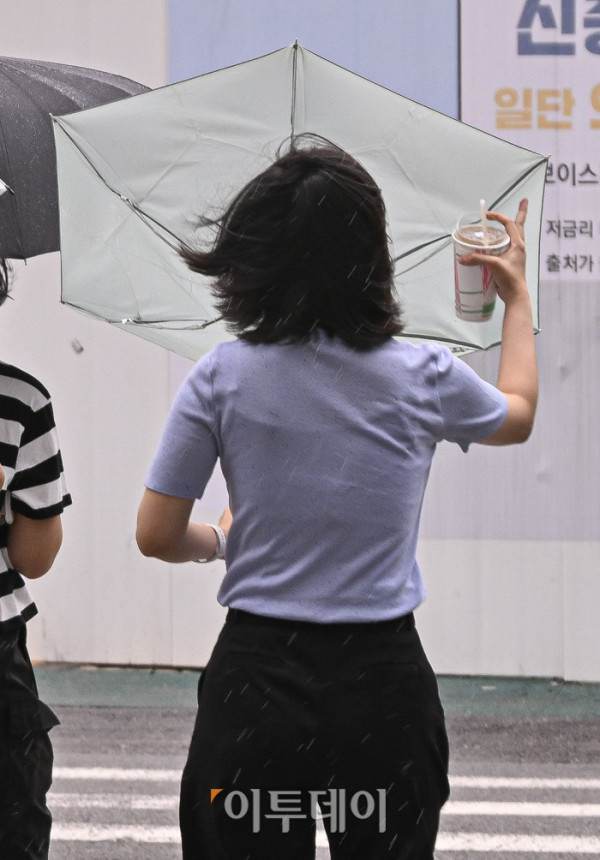 전국 대부분 지역에 돌풍과 함께 천둥·번개를 동반한 많은 비가 내린 6일 서울 종로구 광화문역 일대에서 우산을 쓴 시민이 돌풍으로 인해 뒤집힌 우산을 부여잡고 있다. 기상청에 따르면 새벽에 중부지방과 경북 북부에 비가 시작돼 오전부터 그 밖의 남부지방과 제주도로 확대될 것으로 예보했다. 조현호 기자 hyunho@