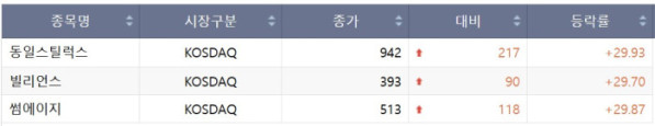 코스닥 시장에서는 동일스틸럭스(29.93%), 빌리언스(29.70%), 썸에이지(29.87%)가 상한가, 네이처셀(-29.89%)은 하한가였다.