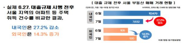 반면 수도권을 포함한 내국인 대상 대출 규제는 강화되는 추세다. 주택담보대출 한도 축소, 의무 전입 조건 등 ‘6.27 대출 규제’가 적용되며, 부동산 시장 안정 효과도 나타나고 있다. 그러나 외국인은 자국에서 자금을 조달하기 때문에 국내 대출 규제를 우회할 수 있어 부동산 정책 효과를 저해할 우려가 있다는 지적이 나온다.