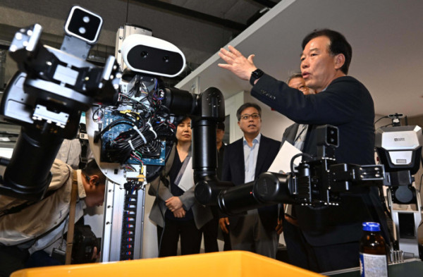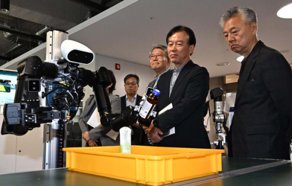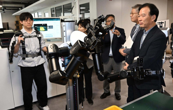▲정태호 국정기획위원회 경제1분과 위원장이 7일 서울 관악구 서울대 AI연구원에서 열린 국정위 ‘기술과 아이디어로 혁신하는 우리곁의 AI 클러스터’ 현장방문 행사에서 원격조종을 통한 데이터수집 및 모방학습 추론 시연을 살펴보고 있다. 신태현 기자 holjjak@