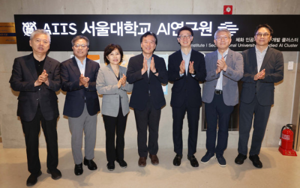 ▲정태호 국정기획위원회 경제1분과 위원장 등이 7일 서울 관악구 서울대 해동첨단공학관에서 열린 국정위 ‘기술과 아이디어로 혁신하는 우리곁의 AI 클러스터’ 현장방문 행사에서 AI로봇 시연 참관에 앞서 기념촬영을 하고 있다. 사진 왼쪽부터 홍성국 국정위 기획위원, 장병탁 서울대 AI연구원장, 김은경 국정위 기획위원, 정 위원장, 김준기 서울대 기획부총장, 이종욱 국정위 기획위원, 박원호 서울대 기획처장. 신태현 기자 holjjak@