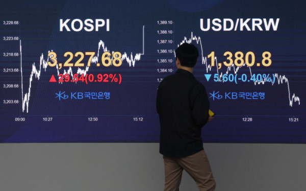 코스피가 미국 상호 관세 발효와 세제 개편안 재검토 등 대내외 불확실성에도 3200선을 회복하며 상승 마감했다. 7일 서울 여의도 KB국민은행 스마트딜링룸 모니터에 코스피 종가가 표시되고 있다. 이날 코스피는 전일 대비 29.54p(0.92%) 오른 3227.68에 장을 마쳤다.