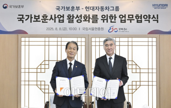 ▲권오을(왼쪽) 국가보훈부 장관과 성 김 현대자동차그룹 전략기획담당 사장이 8일 서울 동작구 국립서울현충원에서 열린 국가보훈부-현대자동차그룹 국가보훈사업 활성화를 위한 업무협약식에서 협약서에 사인을 마친 후 기념촬영을 하고 있다. 조현호 기자 hyunho@