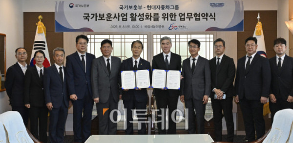 ▲권오을(왼쪽 여섯 번째) 국가보훈부 장관과 성 김(왼쪽 일곱 번째) 현대자동차그룹 전략기획담당 사장이 8일 서울 동작구 국립서울현충원에서 열린 국가보훈부-현대자동차그룹 국가보훈사업 활성화를 위한 업무협약식에서 협약서에 사인을 마친 후 참석자들과 기념촬영을 하고 있다. 조현호 기자 hyunho@