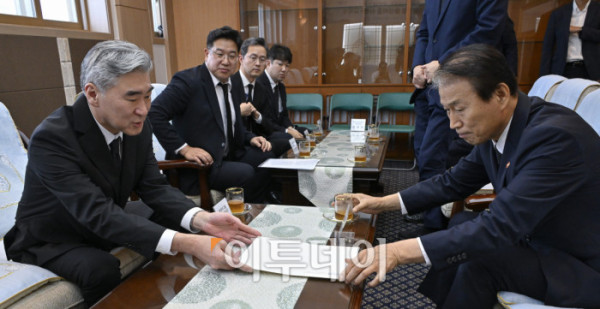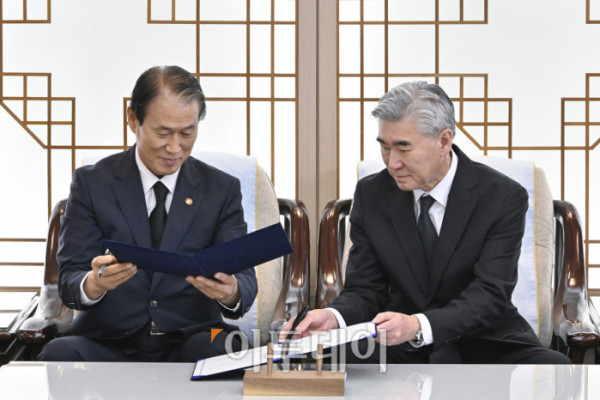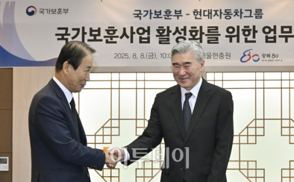 ▲성 김(왼쪽) 현대자동차그룹 전략기획담당 사장이 8일 서울 동작구 국립서울현충원에서 열린 국가보훈부-현대자동차그룹 국가보훈사업 활성화를 위한 업무협약식에 앞서 권오을 국가보훈부 장관에게 정의선 현대자동차그룹 회장의 취임 축하 서신을 전달하고 있다. 조현호 기자 hyunho@