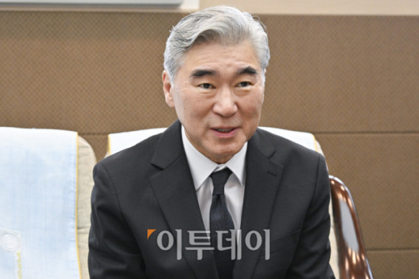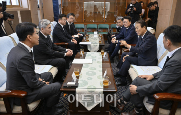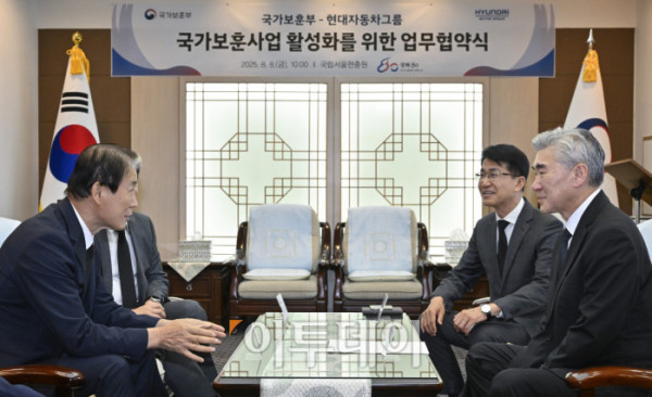 ▲성 김 현대자동차그룹 전략기획담당 사장이 8일 서울 동작구 국립서울현충원에서 열린 국가보훈부-현대자동차그룹 국가보훈사업 활성화를 위한 업무협약식에 앞서 권오을 국가보훈부 장관과 티타임을 갖고 있다. 조현호 기자 hyunho@