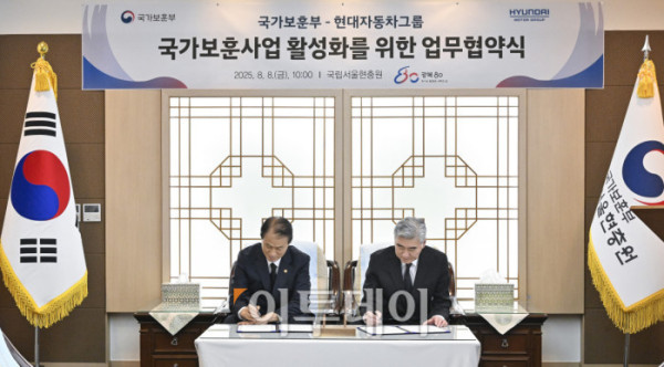 ▲권오을(왼쪽) 국가보훈부 장관과 성 김 현대자동차그룹 전략기획담당 사장이 8일 서울 동작구 국립서울현충원에서 열린 국가보훈부-현대자동차그룹 국가보훈사업 활성화를 위한 업무협약식에서 협약서에 사인을 하고 있다. 조현호 기자 hyunho@