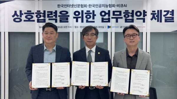 한국인터넷신문협회는 한국인공지능협회, 비큐AI와 '소버린 인공지능(AI) 구현을 위한 뉴스데이터 파이프라인 구축'에 관한 3자 전략적 업무협약(MOU)' 을 체결했다고 8일 밝혔다.
