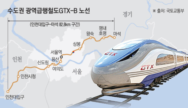 앞으로 약 72개월(2031년 개통 예정) 공사 기간이 소요될 것으로 보이는 B 노선은 인천 송도국제도시(인천대입구역)에서 시작해 여의도, 용산, 서울역, 청량리를 지나 남양주 마석까지 총 82.8km를 잇는다. 완공 시 수도권 서남부ㆍ동북부 지역 교통 여건이 개선될 것으로 보인다.