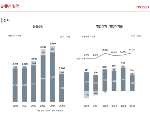 레드캡투어의 올해 상반기 누적 매출은 2000억 원, 영업이익은 314억 원이다. 지난해 상반기는 매출 1845억 원, 영업이익 252억 원이었다. 렌터카 사업의 경우 올해 상반기 누적 매출이 1792억 원, 영업이익은 272억 원으로 집계됐다. 지난해 상반기 누적 매출 1628억 원, 213억 원 대비 각각 10.0%, 27.1% 증가했다.