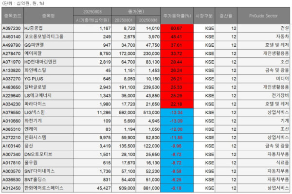 이외에도 화인베스틸(26.24%), YG PLUS(26.21%), 달바글로벌(25.33%), LS에코네어지(25.29%), 파라다이스(22.18%) 등이 이번 주 강세를 보였다.