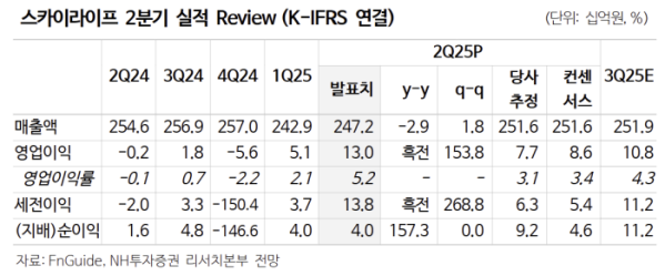스카이라이프의 2분기 매출액은 전년 동기 대비 2.9% 감소한 2472억 원, 영업이익은 흑자전환한 130억 원으로 영업이익은 시장 컨센서스를 크게 상회했다. 위성 방송 가입자 및 매출 감소세는 불가피하나, 본사 및 스카이라이프TV의 비용 절감 노력으로 영업이익이 개선됐다는 설명이다.