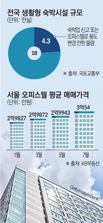 오피스텔을 단기간에 늘릴 가장 효과적인 방법으로는 생숙의 오피스텔 전환이 꼽힌다. 생숙은 과거 ‘레지던스’로 불리던 숙박용 호텔에 주거용 오피스텔을 합친 개념이다. 외관상 아파트와 다르지 않지만, 숙박시설인 만큼 자가로 사용하거나 임대하는 것은 불법이다. 때문에 오피스텔로 용도 변경 등을 하지 않고 주거용으로 사용하면 공시가격의 10%에 달하는 이행강제금을 매년 내야 한다. 국토교통부에 따르면 현재 전국 생숙은 총 18만여 실이며, 준공 후 숙박업으로 신고하거나 오피스텔로 용도 변경하지 않은 물량은 4만3000실 수준이다.