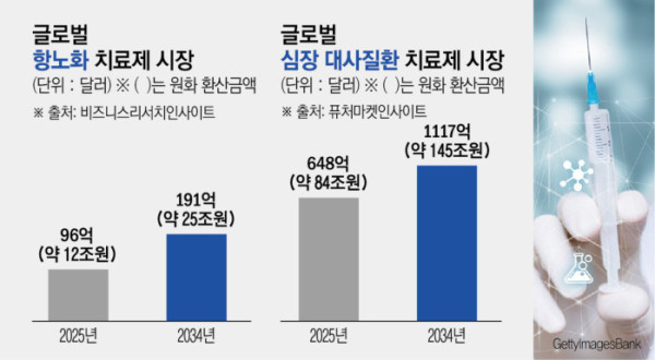 전 세계적인 인구 고령화로 심장대사질환 치료제 시장은 점점 거대해질 것으로 기대된다. 퓨처마켓인사이트에 따르면 이 시장은 2025년 648억 달러(약 84조 원) 규모에서 10년 후 1117억 달러(약 145조 원) 규모로 성장할 전망이다.