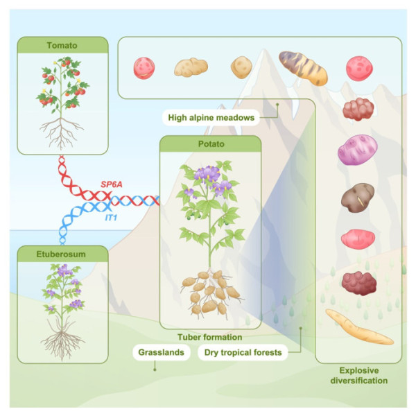 중국농업과학원 선전농업유전체연구소가 주축이 된 다국적 공동연구팀은 감자아속 식물의 원산지인 중남미 곳곳에서 채집한 재배(작물) 및 야생 감자와 토마토, 에투베로숨 등 수백 개 식물체 시료의 게놈을 분석해 비교한 결과 이런 결론을 내렸다. 감자의 덩이줄기 형성에 관여하는 유전자들의 ‘출신’이 드러났고 특히 토마토의 SP6A 유전자와 에투베로숨의 IT1 유전자의 만남이 결정적이라는 사실이 밝혀졌다.