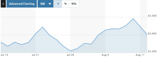 11일(현지시간) 블룸버그통신에 따르면 뉴욕상품거래소(COMEX)에서 거래의 중심이 되는 12월물 금 선물은 전장보다 86.6달러(2.5%) 내린 온스당 3404.7달러에 장을 마감했다.