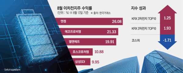 12일 한국거래소에 따르면 이달 들어 ‘KRX 2차전지 TOP10 지수’는 1.25% 상승했다. 이차전지 관련 종목을 여럿 편입하고 있는 ‘KRX 전기차 Top15 지수’는 1.93% 올랐다. 같은 기간 코스피 지수(-1.71%) 성과를 앞지르며 국내 테마지수 최상위 성과를 기록했다. 연초 이후 각각 0.14%, 1.84% 오르는 데 그치며 코스피 랠리를 따라오지 못하던 것과 대조적이다.