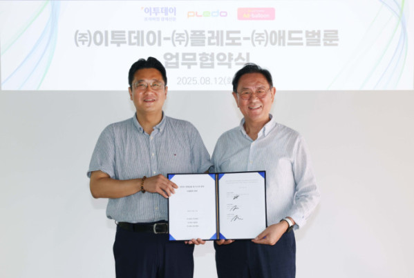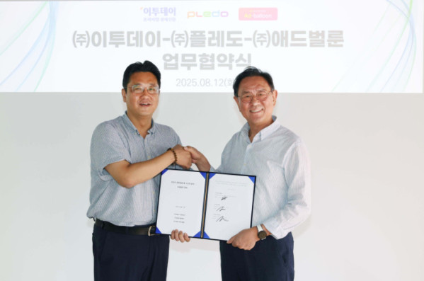 이종재(오른쪽) 이투데이그룹 부회장과 김관석 플레도-애드벌룬 대표이사가 12일 서울 강남구 이투데이에서 열린 이투데이-플레도-애드벌룬 ‘어린이 경제금융 및 시니어 분야’ 업무협약식에서 기념촬영을 하고 있다.