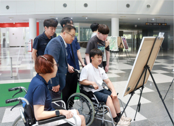 ▲발달장애인 작가 13명의 AI 창작 작품 전시회 '도화지 위의 꿈'에서 휠체어를 이용하는 2명의 작가와 참석자들이 판교글로벌R&D센터 로비에 전시된 작품을 관람하고 있다. (경기도경제과학진흥원)