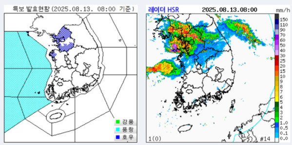 13일 중부지방을 중심으로 돌풍과 천둥·번개를 동반한 강한 비가 이어지고 있다. 기상청은 서울·인천·경기와 충남 북부 서해안에 호우특보를 발효하고 각별한 주의를 당부했다.
