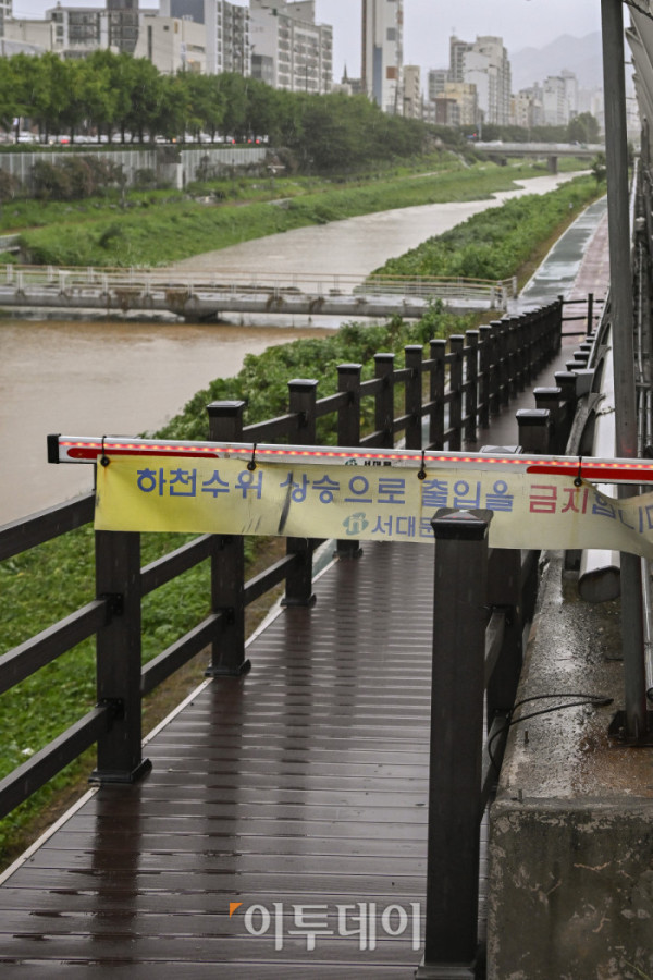 ▲서울 등 경기도 일대와 충남 서해안에 호우주의보가 발효된 13일 서울 서대문구 불광천 산책로의 출입이 전면 통제되고 있다. 이날 새벽부터 서울에 내린 많은 비로 청계천, 안양천 등 시내 전체 29개 하천의 출입이 통제됐다. 서울 동북·서남·서북권에는 오전 6시 30분을 기해 호우주의보가 내려지며, 서울시는 강우 상황과 관련해 '주의' 단계인 1단계를 발령하고 비상근무에 들어갔다. 조현호 기자 hyunho@