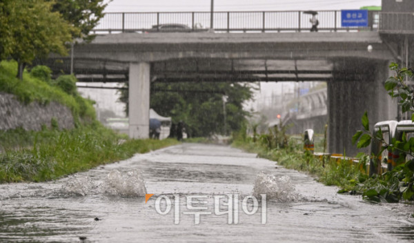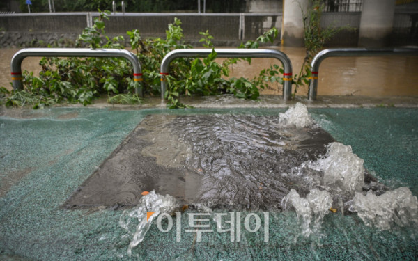▲서울 등 경기도 일대와 충남 서해안에 호우주의보가 발효된 13일 서울 서대문구 불광천 산책로에 물이 솟구치고 있다. 이날 새벽부터 서울에 내린 많은 비로 청계천, 안양천 등 시내 전체 29개 하천의 출입이 통제됐다. 서울 동북·서남·서북권에는 오전 6시 30분을 기해 호우주의보가 내려지며, 서울시는 강우 상황과 관련해 '주의' 단계인 1단계를 발령하고 비상근무에 들어갔다. 조현호 기자 hyunho@