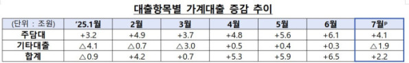 구체적으로 주택담보대출은 2조2000억원 늘었다. 6월(3조8000억 원)보다 증가폭이 둔화됐다. 같은기간 정책대출 역시 1조2000억 원 늘어나는데 그쳤다. 기타대출은 내림세로 돌아서며 6000억 원 줄었다.